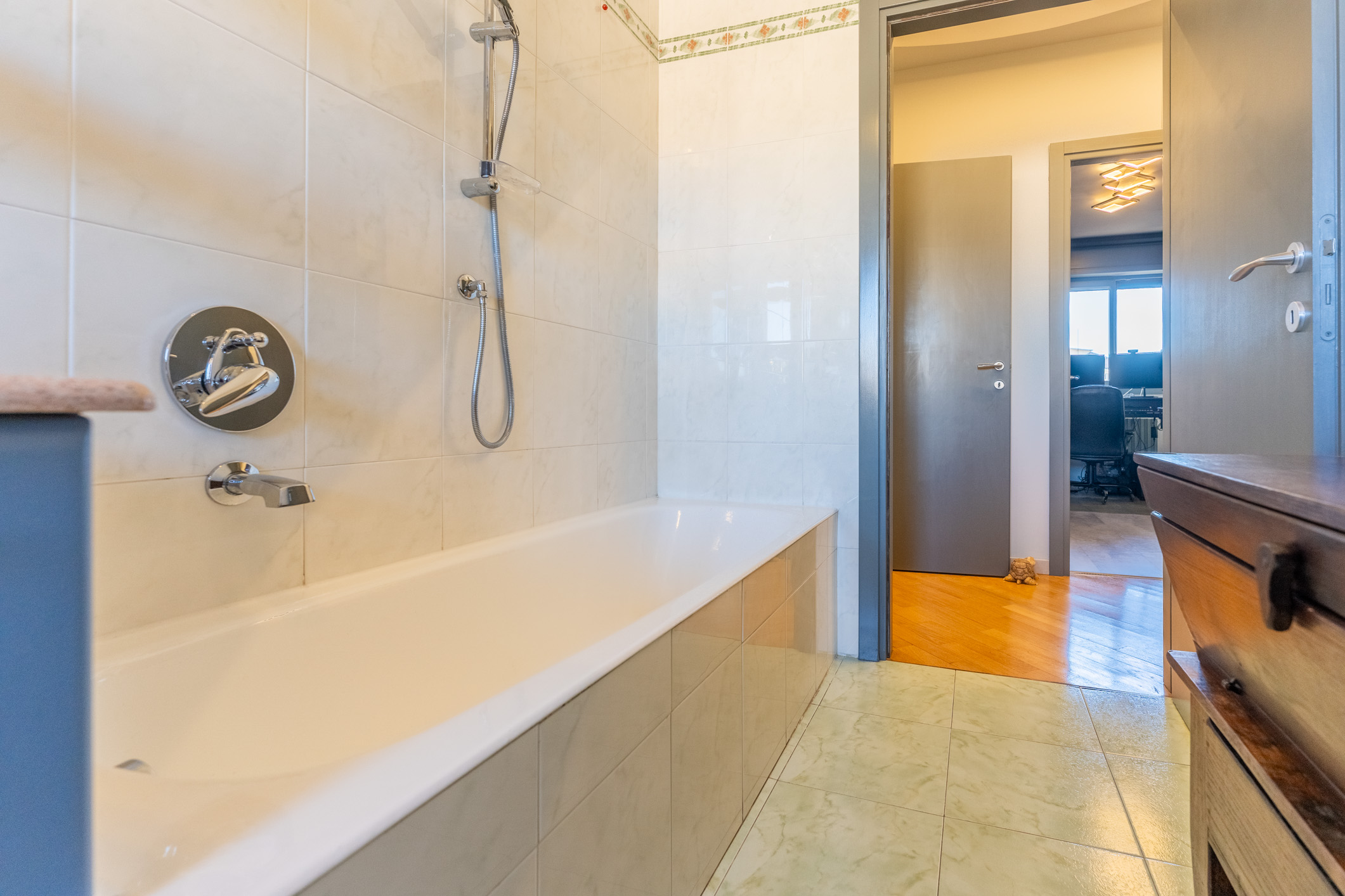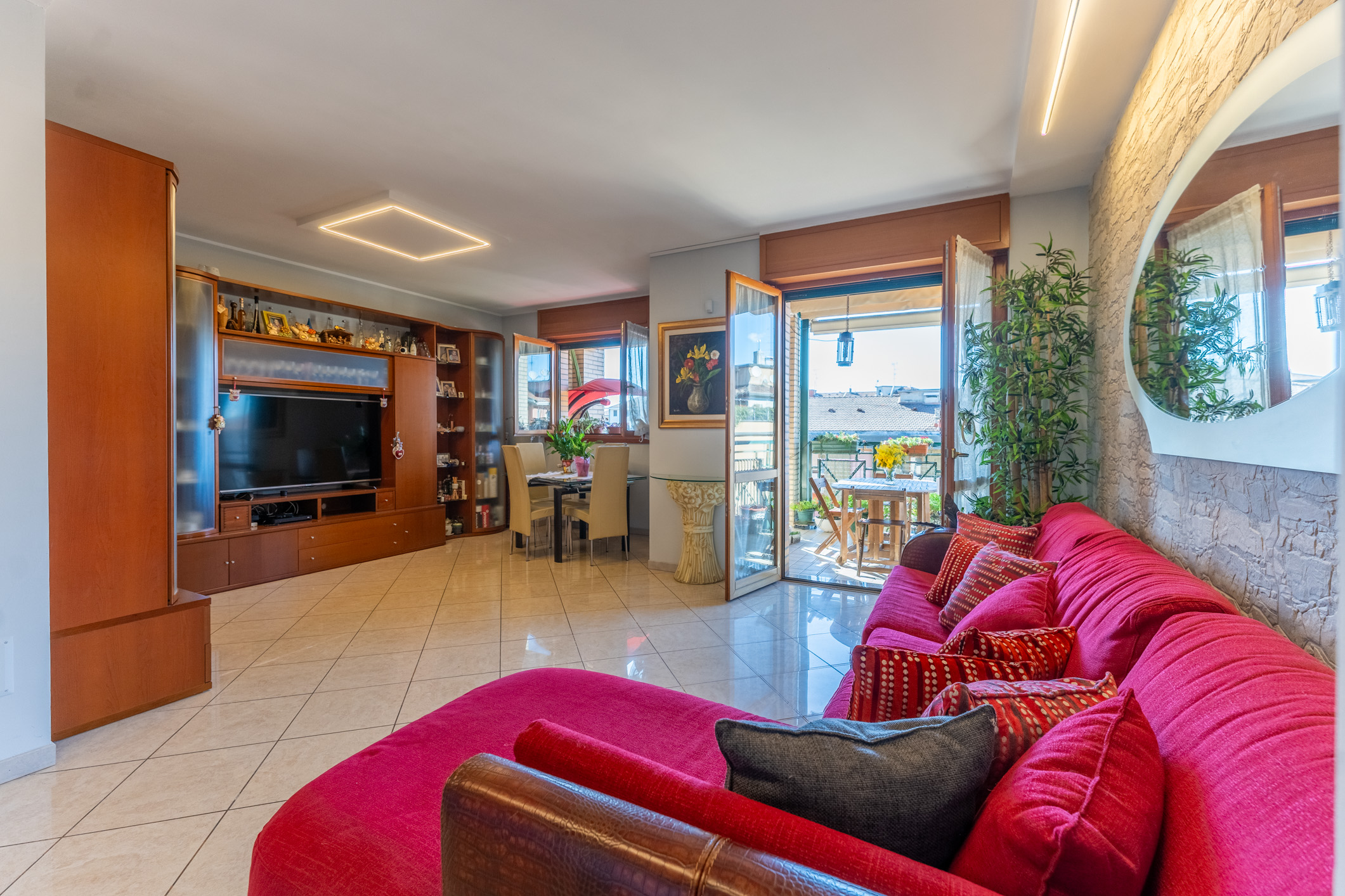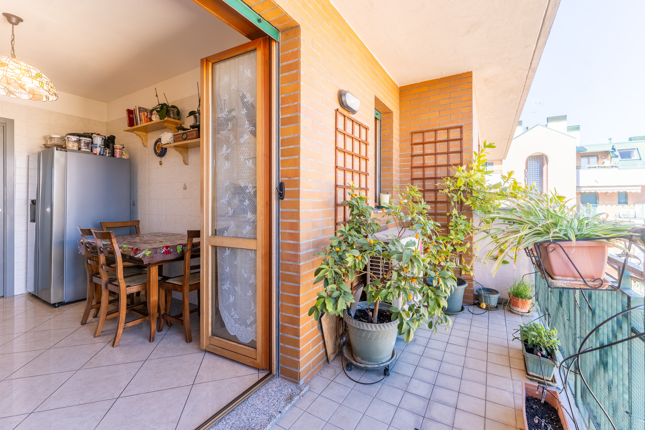 L’appartamento ci accoglie con un ingresso su un ampio e luminoso soggiorno, progettato per ospitare grandi zone relax e aree conviviali per cene in famiglia. Il vero cuore della casa è il fantastico terrazzo ampiamente vivibile, una rarità per la zona. In linea con il soggiorno troviamo la cucina abitabile, servita da un secondo balcone che ospita un funzionale locale lavanderia.
