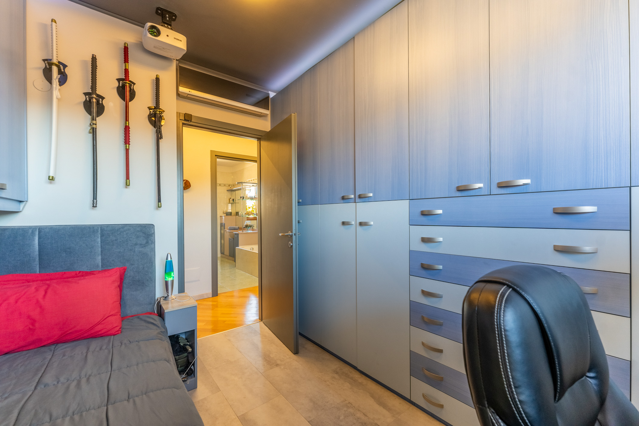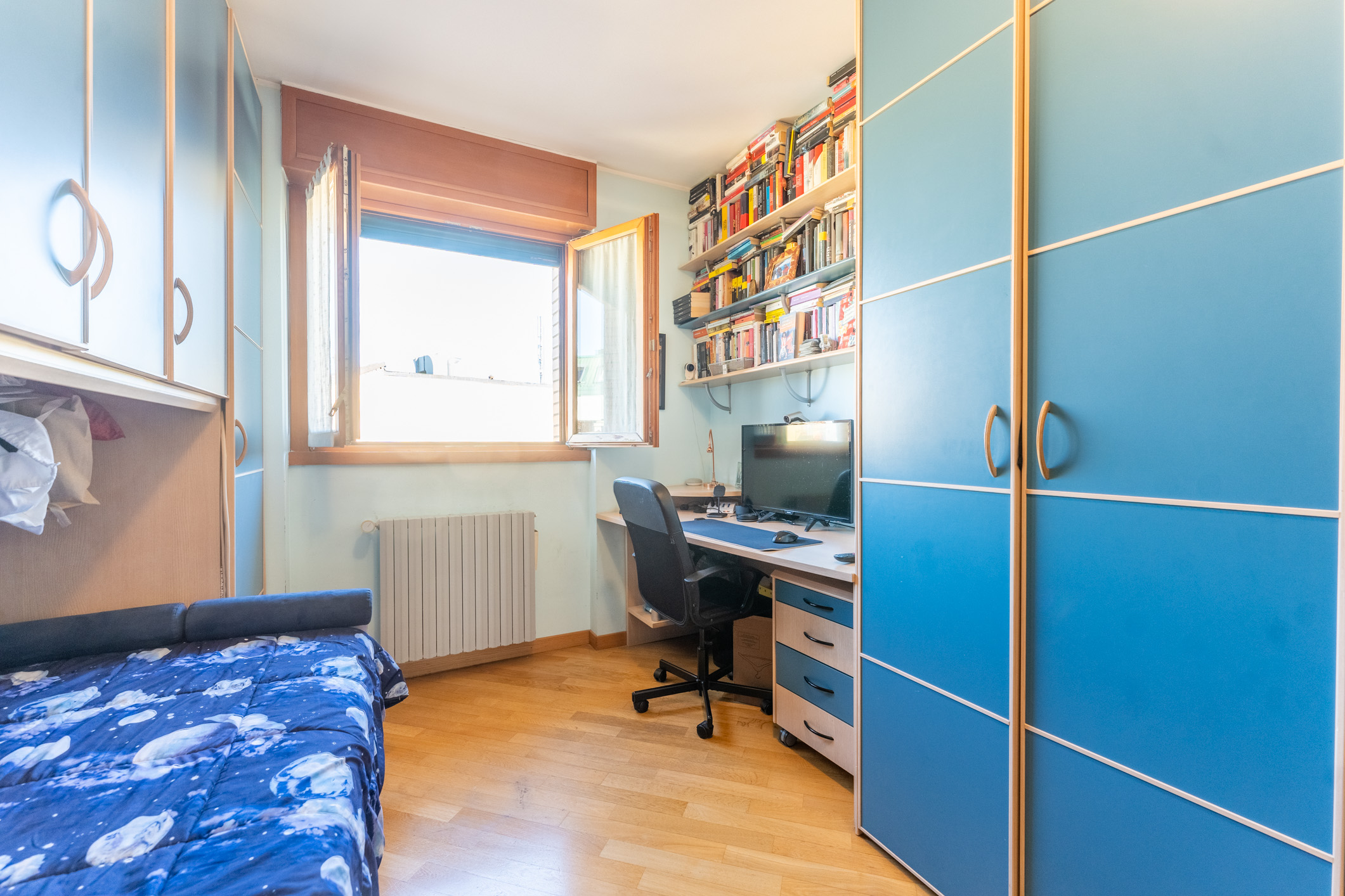 Un corridoio ci conduce alla zona notte, dove troviamo due ampie camere da letto e un primo bagno finestrato con vasca. Il percorso culmina in una riservatissima zona padronale, composta da una terza camera matrimoniale, cabina armadio dedicata e un secondo bagno finestrato con box doccia. Questo quadrilocale con terrazzo in vendita a Milano Gambara si distingue per la tripla esposizione che, unita al piano alto, garantisce una luminosità straordinaria in ogni ambiente.