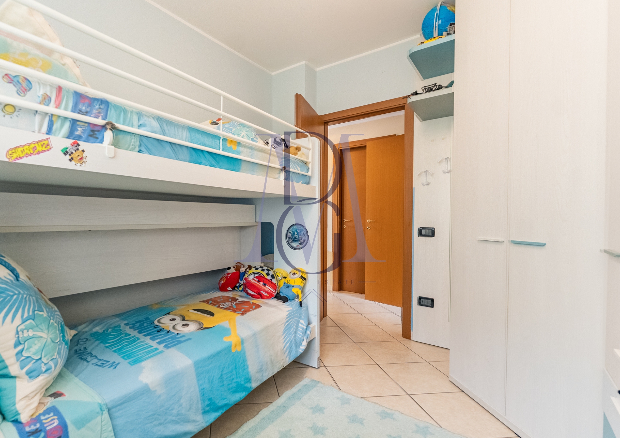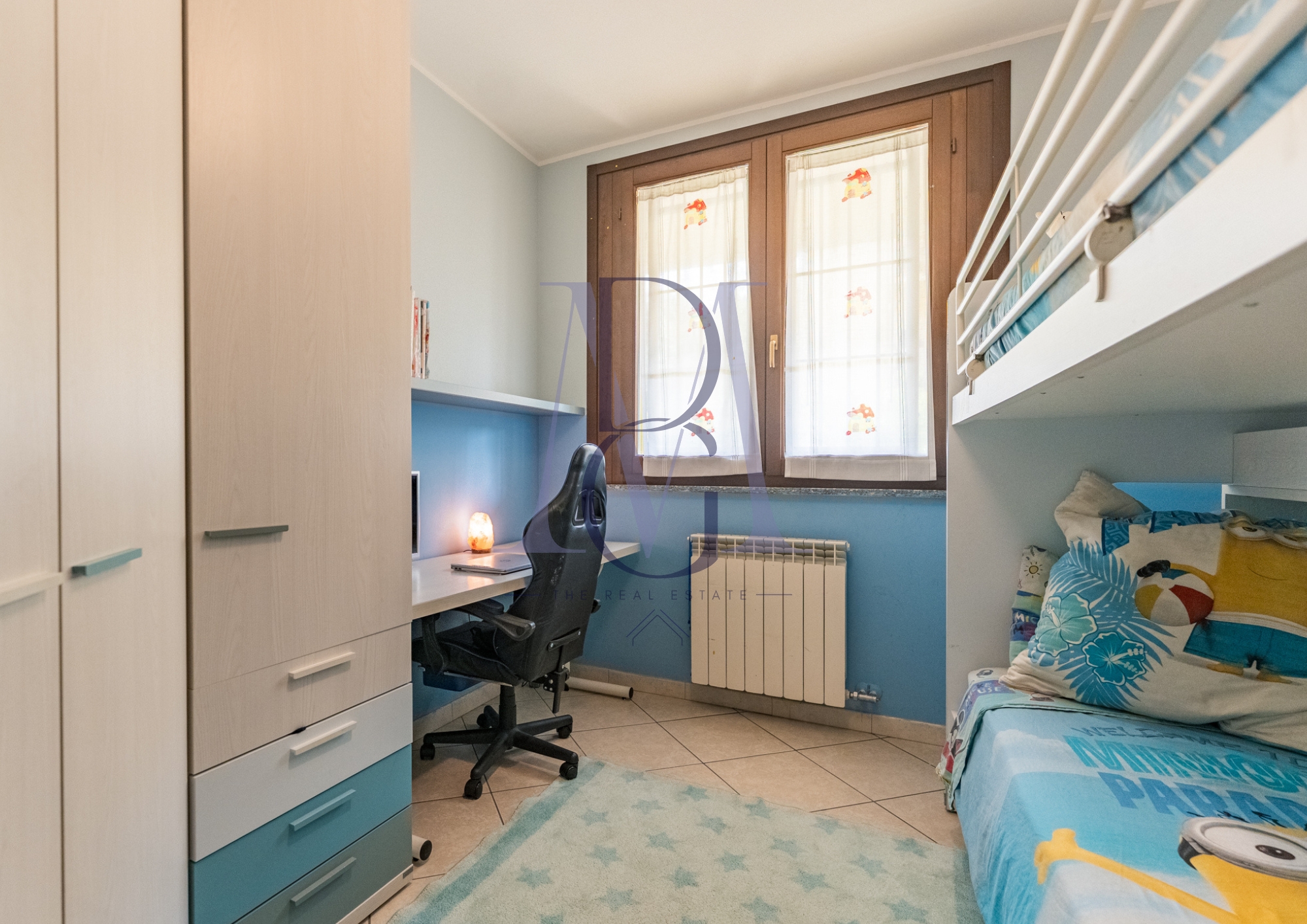 Proseguendo dal soggiorno, un corridoio ci conduce nell’area notte: una spaziosa cameretta attualmente adibita per ospitare due persone, il primo bagno di comodissime dimensioni (finestrato e con vasca) e un secondo servizio con box doccia e sistema di ventilazione. Infine troviamo la camera padronale, di generosissime dimensioni e con porta finestra che consente l’accesso diretto al giardino. La pianta molto lineare dell’appartamento permette di sfruttare al meglio tutti gli ambienti, compreso il corridoio che può essere arredato senza perdere spazio prezioso.